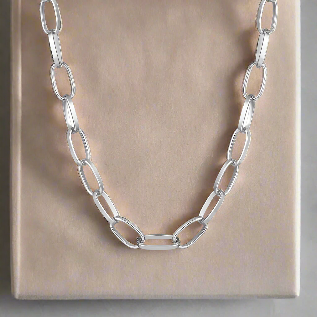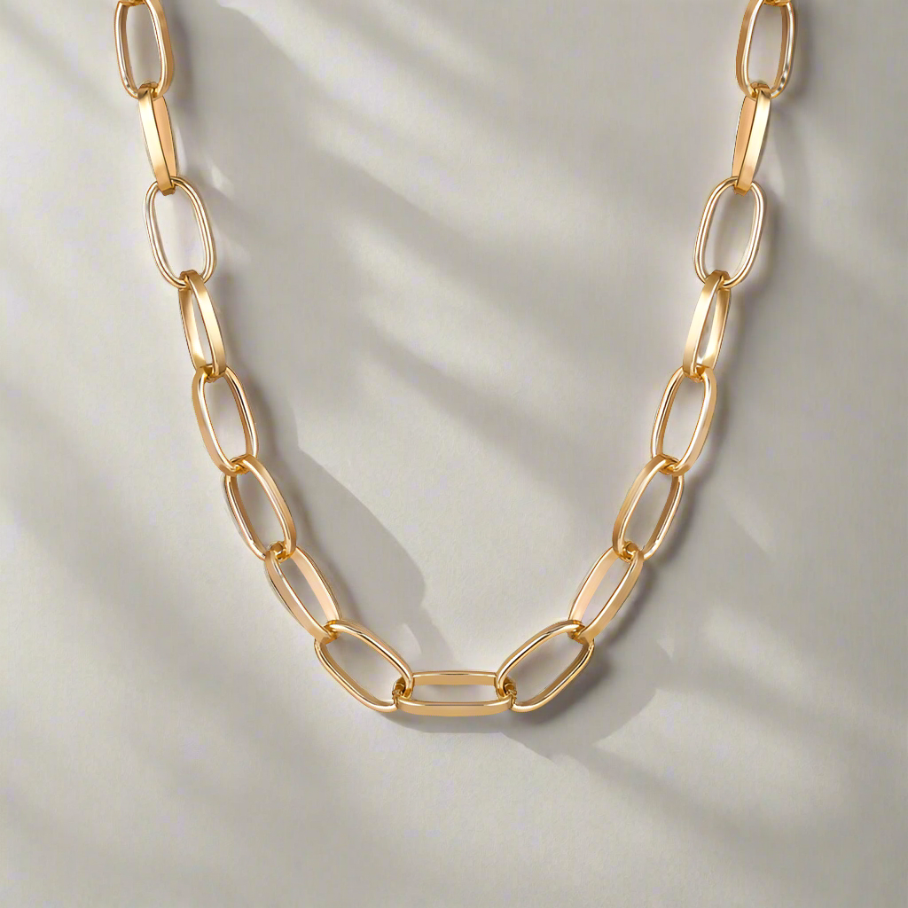 Elevate your style with our Paper Clip Chain Necklace. This bold choker makes a statement on its own or layered with other necklaces. Featuring a unique paper clip chain design, this necklace is both fashionable and versatile. Upgrade your accessory game with this must-have piece.